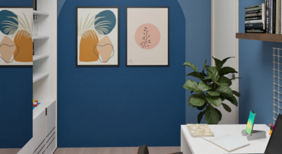 This project involved transforming a small, blank room into a functional home office for a couple with very different design styles. He preferred a modern, traditional look, while she gravitated toward boho and maximalist aesthetics. In addition to creating distinct workspaces for each, the room also needed to accommodate storage for clothes, home items, and books— requiring custom solutions to maximize the limited space.